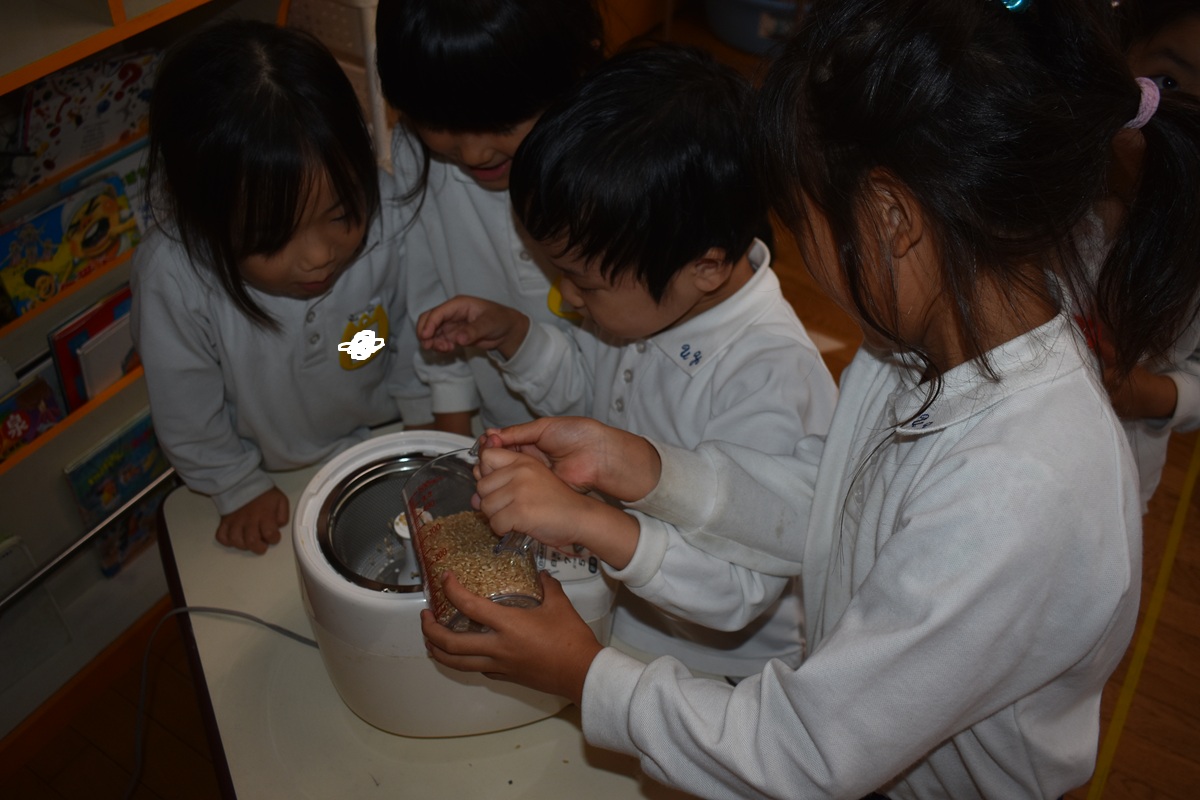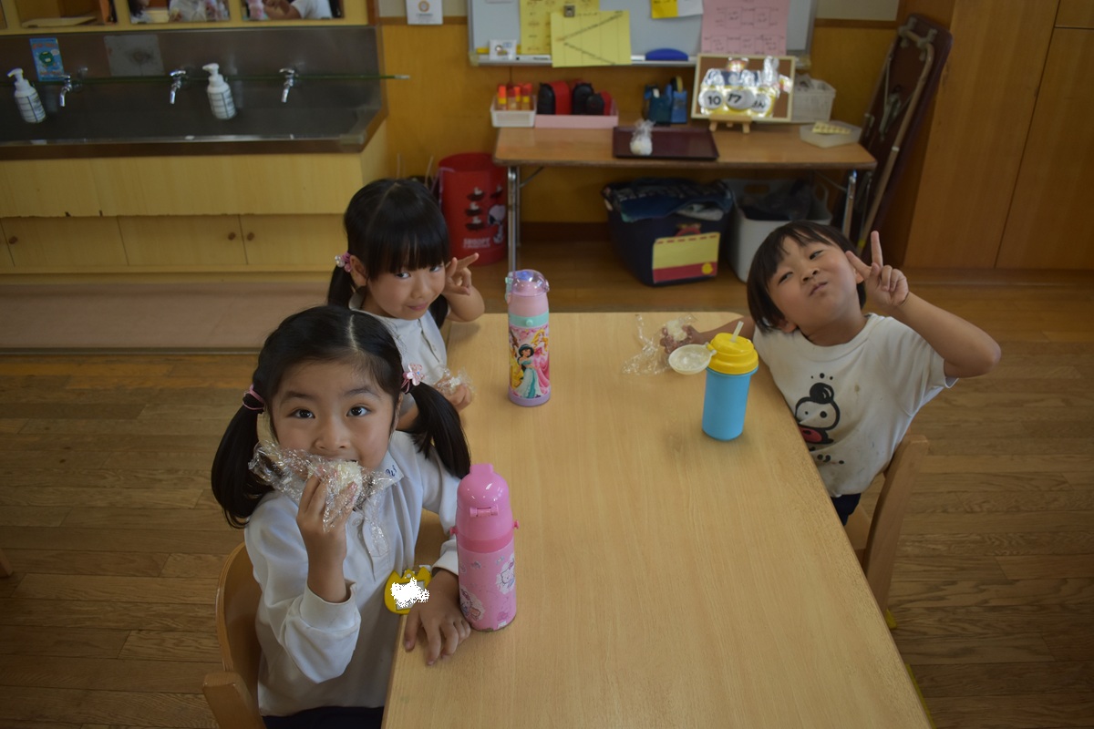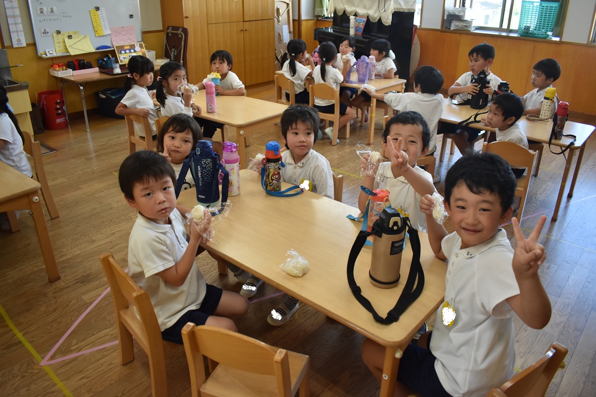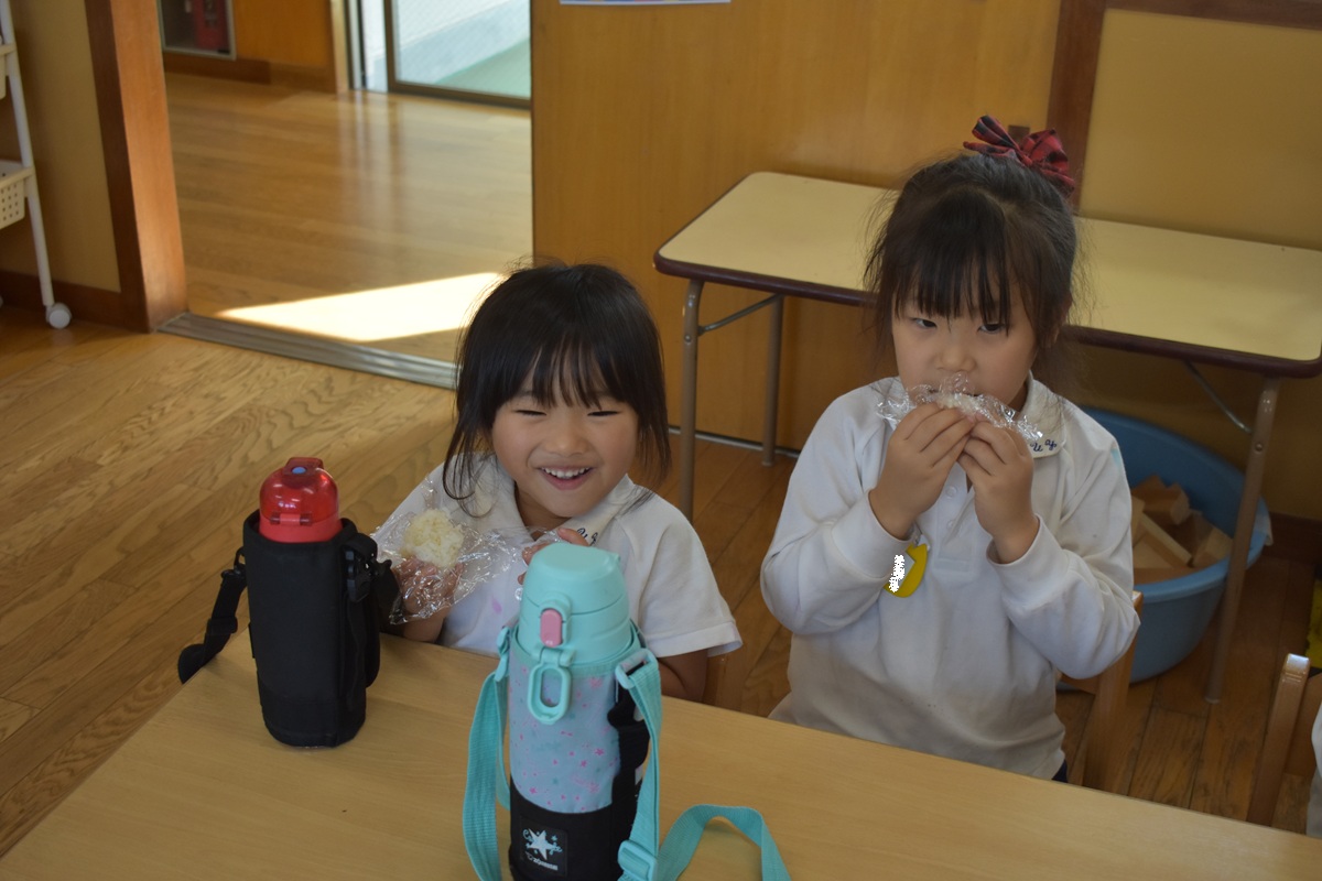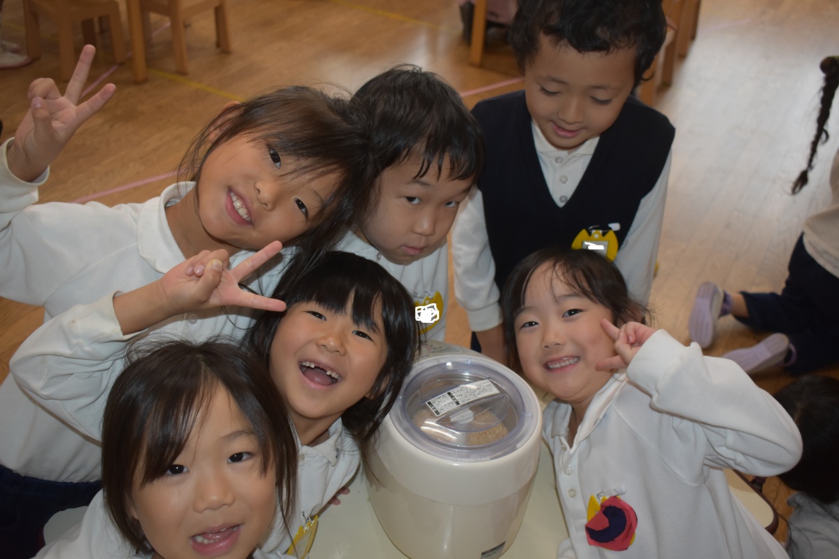 年長組が代かきから始めた田んぼにお米が実り、籾摺り、脱穀をし、精米をして今日おにぎりにして食べました♪