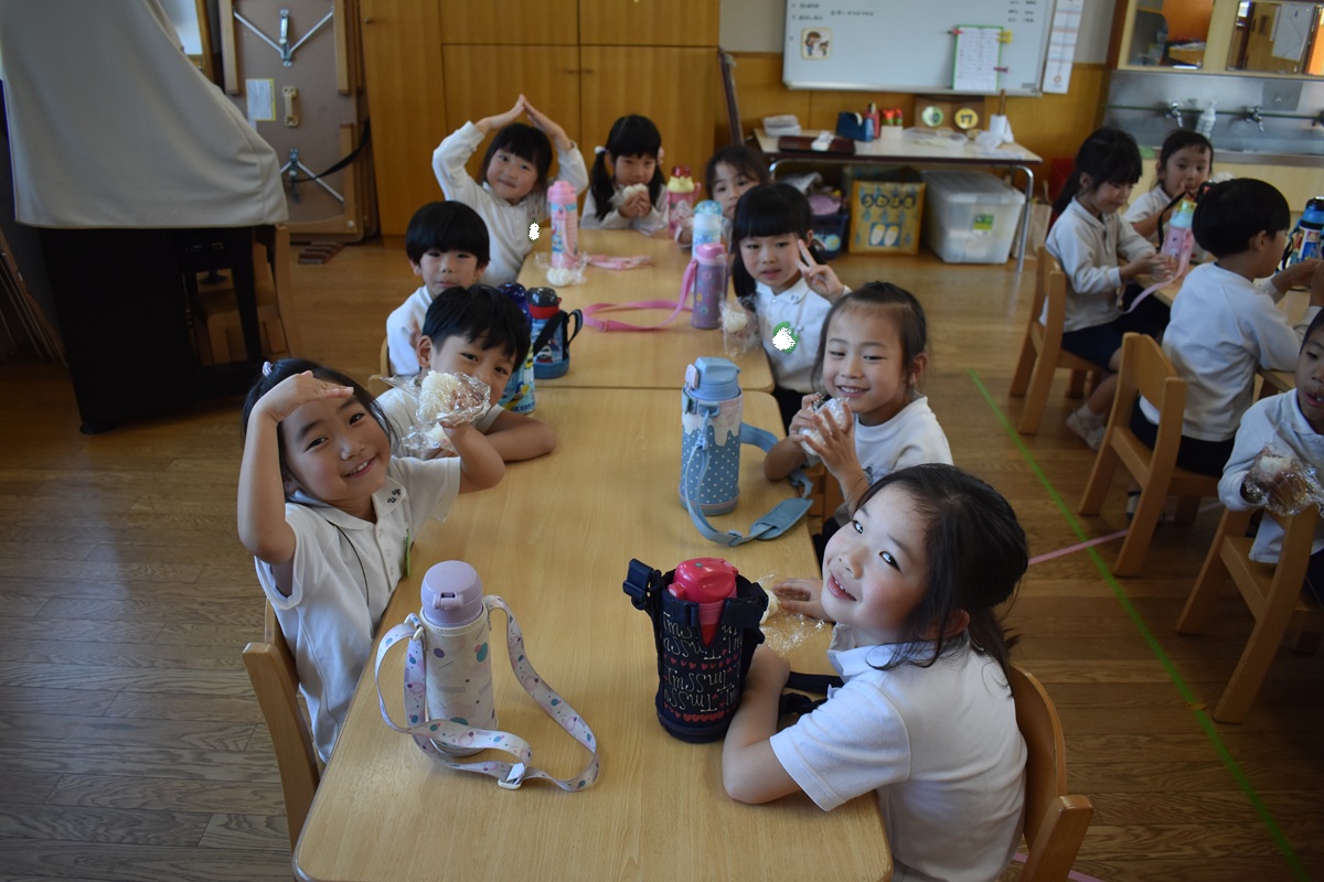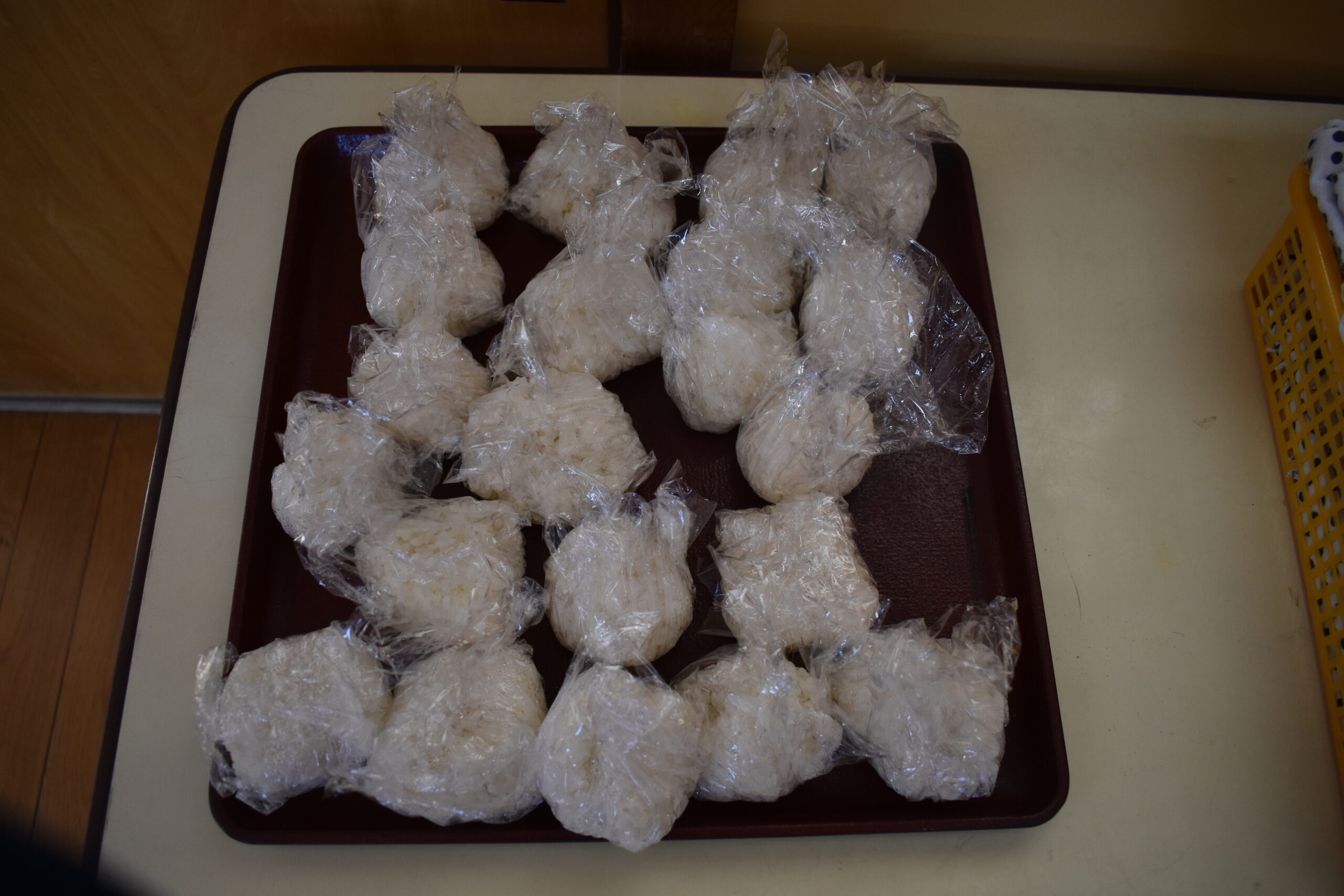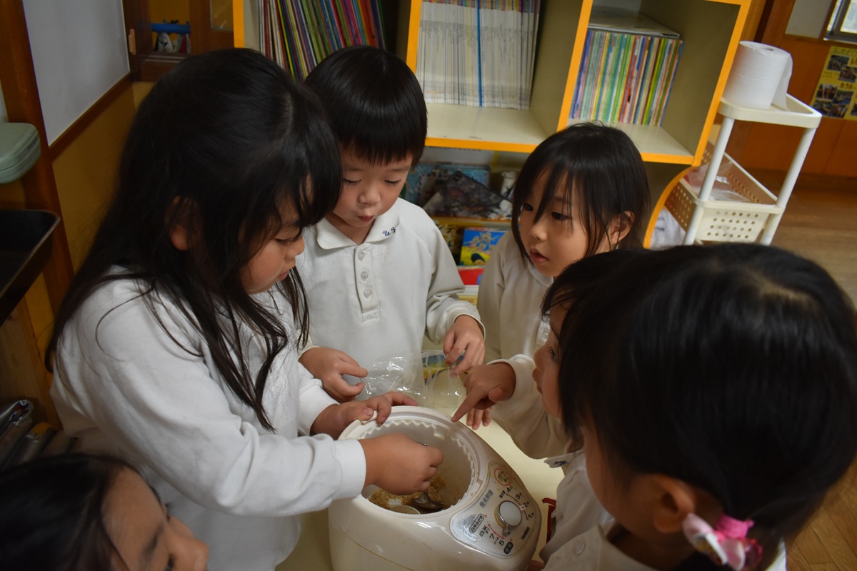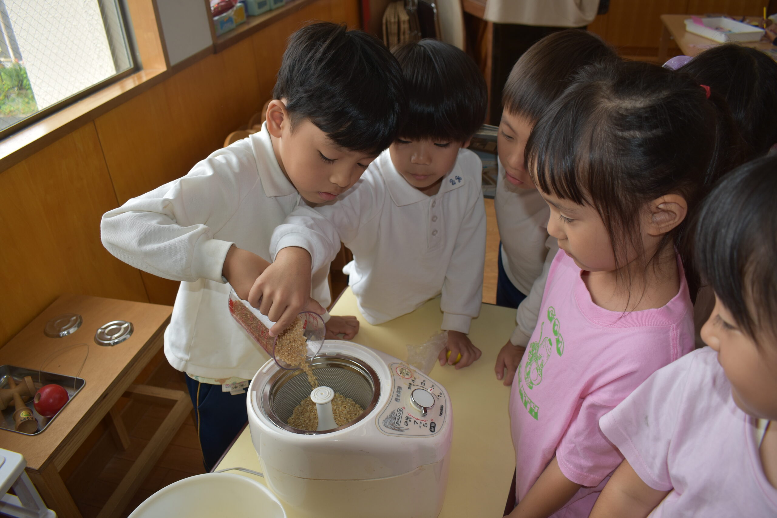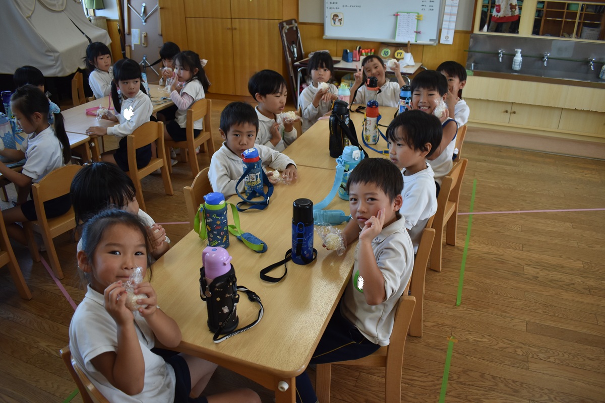 年長組が代かきから始めた田んぼにお米が実り、籾摺り、脱穀をし、精米をして今日おにぎりにして食べました♪