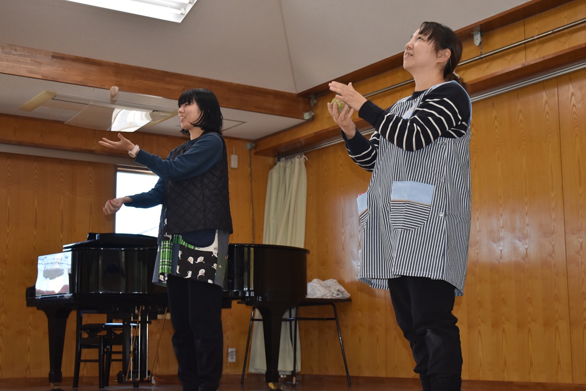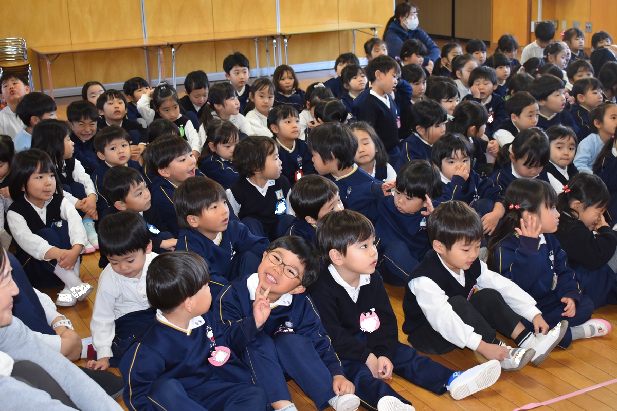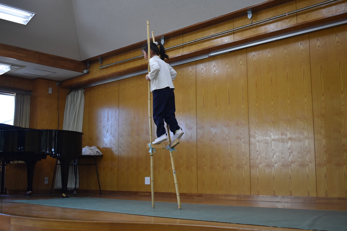 始業式では、年長さんが、投げゴマ、竹馬、けん玉を披露してくれました(^^♪
